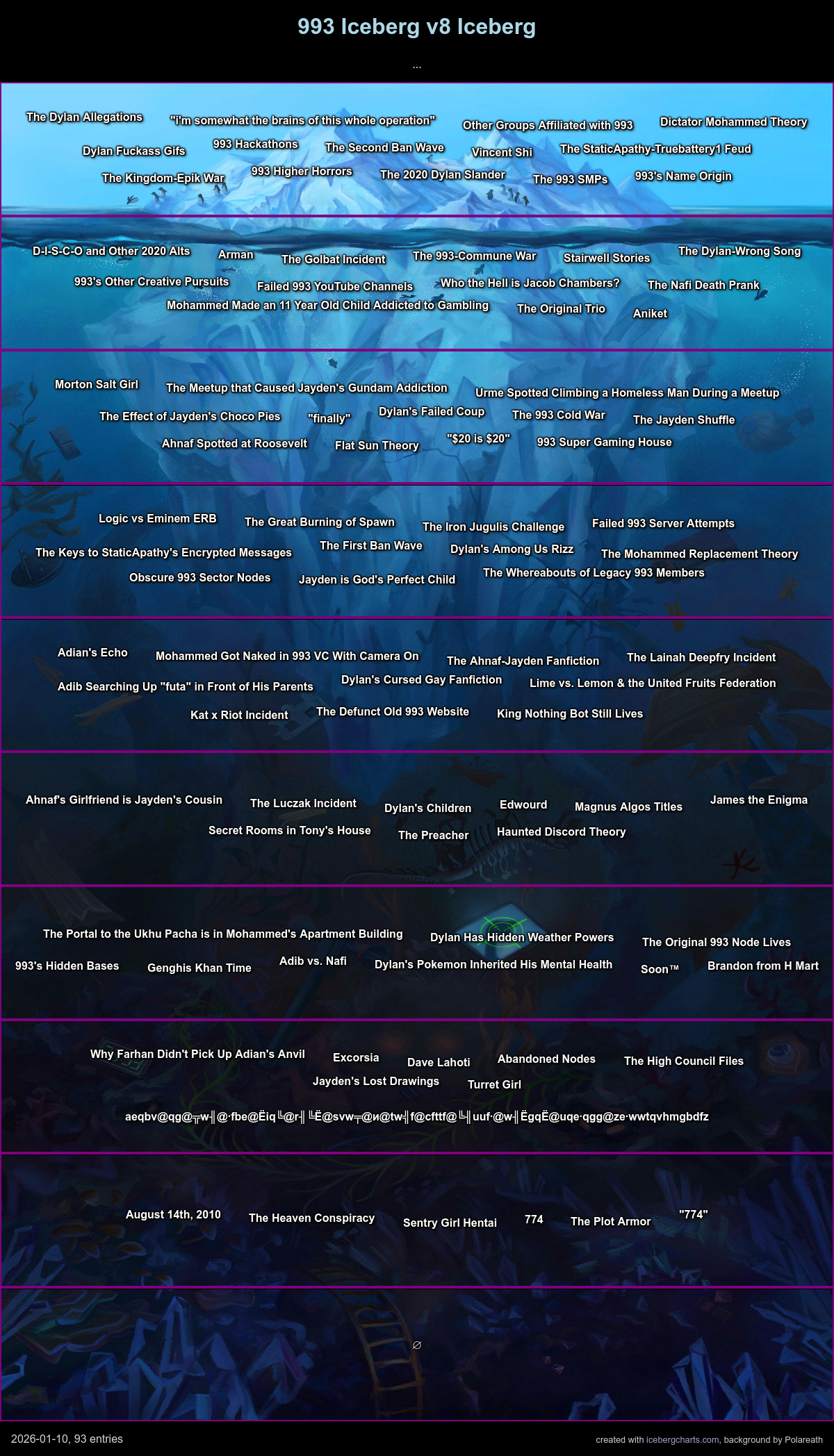 This is the page for the 993 iceberg, which is primarily centered around (real) 993 incidents/events, scaling down to obscurity. Some entries have their own pages with far more detail, and those will be linked down. This page only covers the first layer. Links to the next (and previous) layers will be shown toward the bottom.